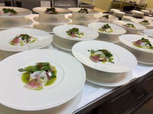 お料理はコース形式にてご提供し、「鰤のミルフィーユサラダ仕立て アメリカンいくら タップナードソース」にはじまり、「野菜のスープ」「白身魚と天使のえび ラタトゥイユ添え トマトソース」「豪州産ロース肉ステーキ 赤ワインソース」など、彩り豊かな品々をお楽しみいただきました。締めにはパティシエ特製デザートとコーヒーをご用意いたしました。